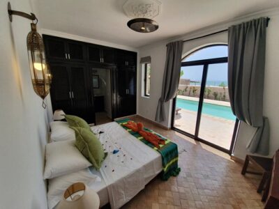 Dar Azreq est un Riad de deux chambres donnant sur la piscine principale et offrant une vue fabuleuse sur l’Océan et les montagnes depuis ses chambres et sa terrasse de toit privée. La villa est construite autour d’un patio salle à manger abrité par une verrière coulissante télécommandée. Jouxtant cette salle, une cuisine américaine entièrement équipée et un salon avec cheminée et coin TV. Un escalier mène à la galerie supérieure qui dessert les deux chambres.